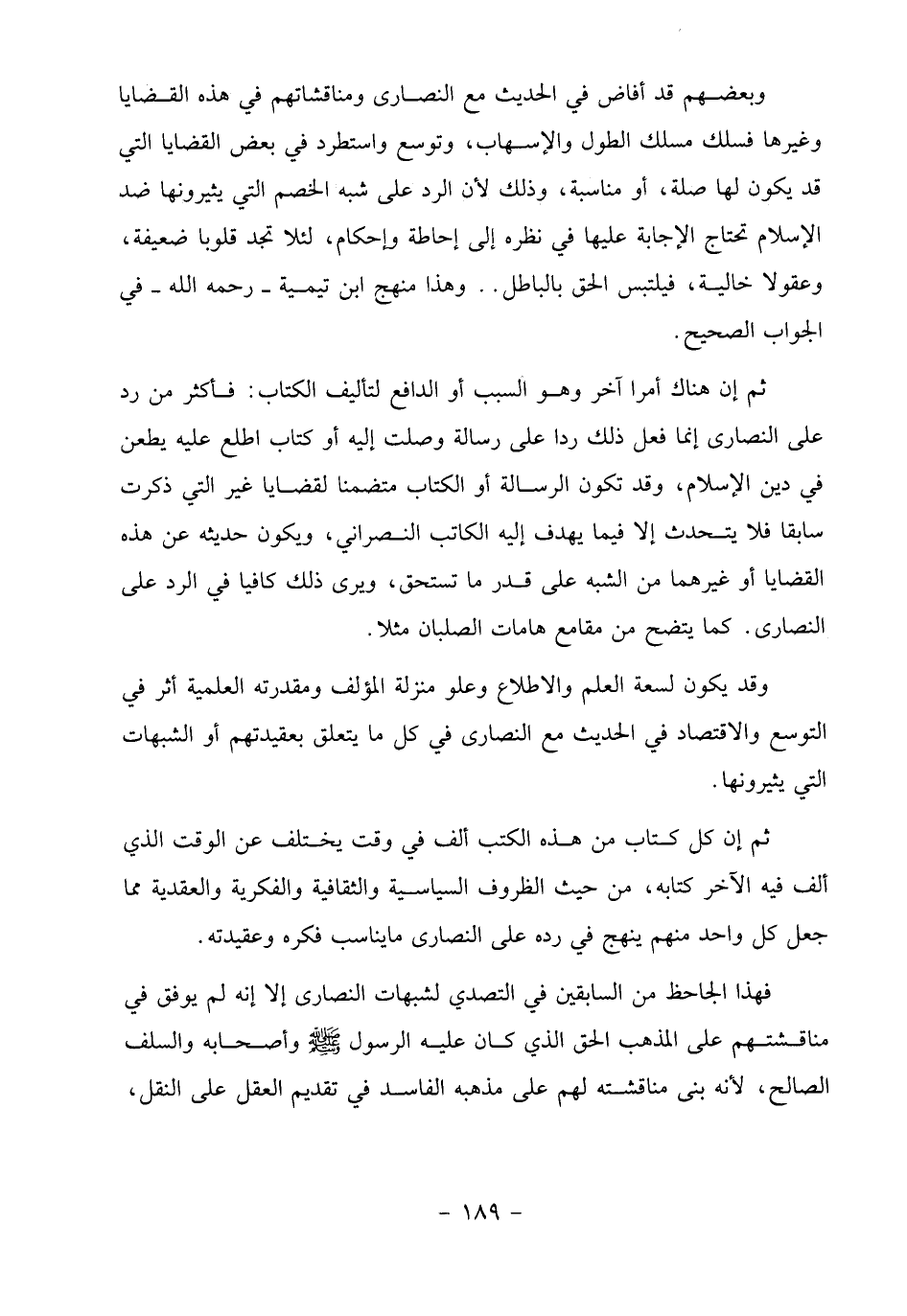 وبعضهم قد أفاض في الحديث مع النصارى ومناقشاتهم في هذه القضايا وغيرها فسلك مسلك الطول والإسهاب، وتوسع واستطرد في بعض القضايا التي قد يكون لها صلة، أو مناسبة، وذلك لأن الرد على شبه الخصم التي يثيرونها ضد الإسلام تحتاج الإجابة عليها في نظره إلى إحاطة وإحكام، لئلا تجد قلوبا ضعيفة، وعقولا خالية، فيلتبس الحق بالباطل ... وهذا منهج ابن تيمية- رحمه الله- في الجواب الصحيح.
