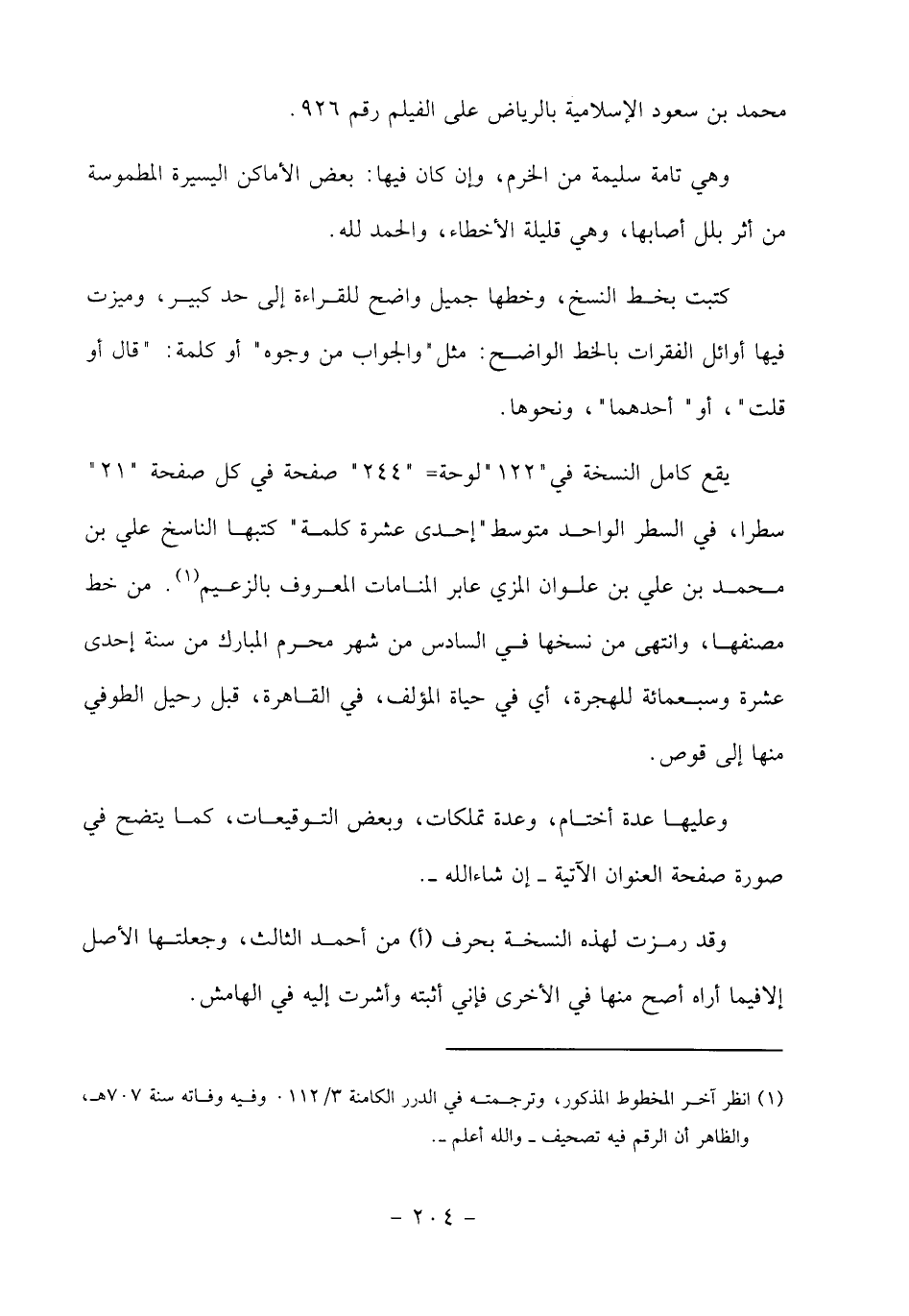 محمد بن سعود الإسلامية بالرياض على الفيلم رقم 926.