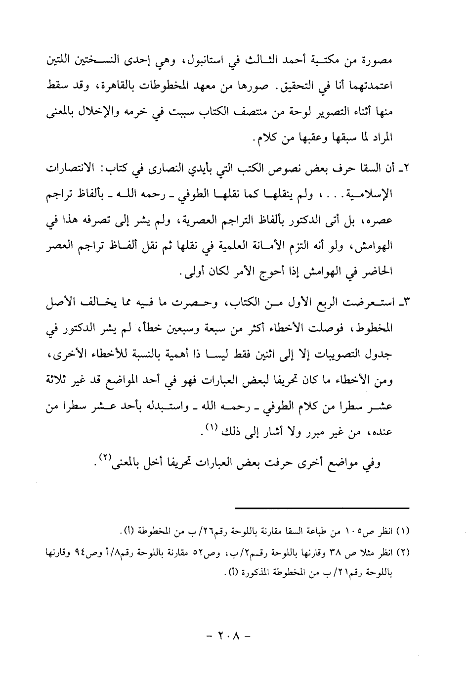 2 - أن السقا حرف بعض نصوص الكتب التي بأيدي النصارى في كتاب: الانتصارات الإسلامية ... ، ولم ينقلها كما نقلها الطوفي- رحمه الله- بألفاظ تراجم عصره، بل أتى الدكتور بألفاظ التراجم العصرية، ولم يشر إلى تصرفه هذا في الهوامش، ولو أنه التزم الأمانة العلمية في نقلها ثم نقل ألفاظ تراجم العصر الحاضر في الهوامش إذا أحوج الأمر لكان أولى.