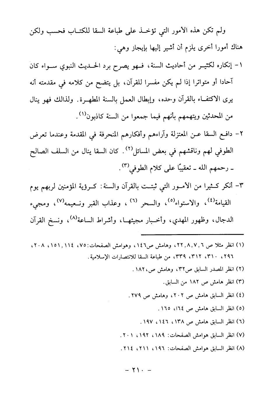 2 - دافع السقا عن المعتزلة وآراءهم وأفكارهم المنحرفة في المقدمة وعند ما تعرض الطوفي لهم وناقشهم في بعض المسائل «2». كان السقا ينال من السلف الصالح- رحمهم الله- تعقيبا على كلام الطوفي «3».