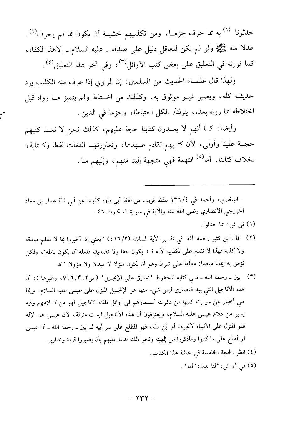 وأيضا: كما أنهم لا يعدون كتابنا حجة عليهم، كذلك نحن لا نعد كتبهم حجة علينا وأولى، لأن كتبهم تقادم عهدها، وتعاورتها اللغات لفظا وكتابة، بخلاف كتابنا. أما «5» التهمة فهي متجهة إلينا منهم، وإليهم منا.