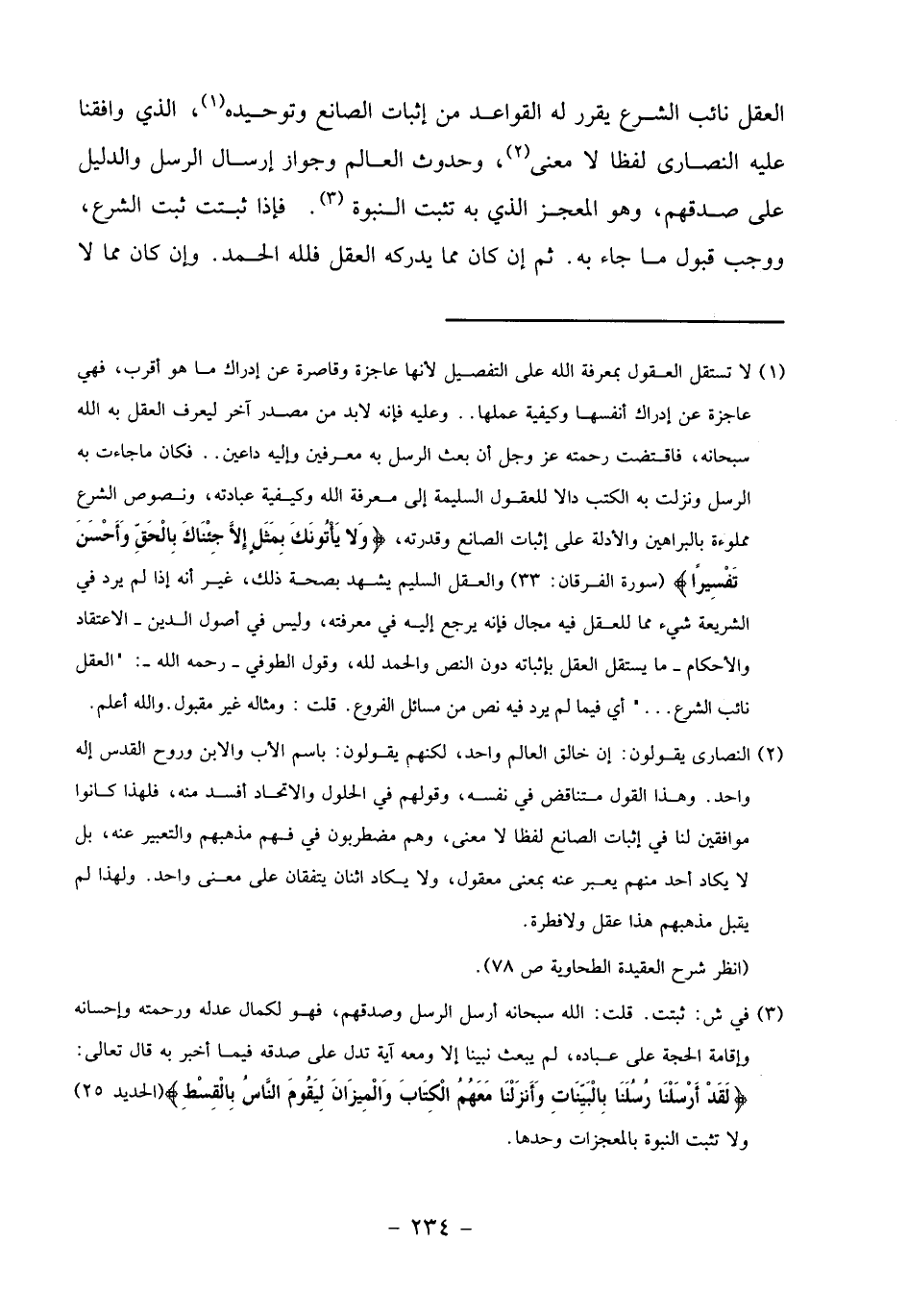 العقل نائب الشرع يقرر له القواعد من إثبات الصانع وتوحيده «1»، الذي وافقنا عليه النصارى لفظا لا معنى «2»، وحدوث العالم وجواز إرسال الرسل والدليل على صدقهم، وهو المعجز الذي به تثبت النبوة «3». فإذا ثبتت ثبت الشرع، ووجب قبول ما جاء به. ثم إن كان مما يدركه العقل فلله الحمد. وإن كان مما لا
