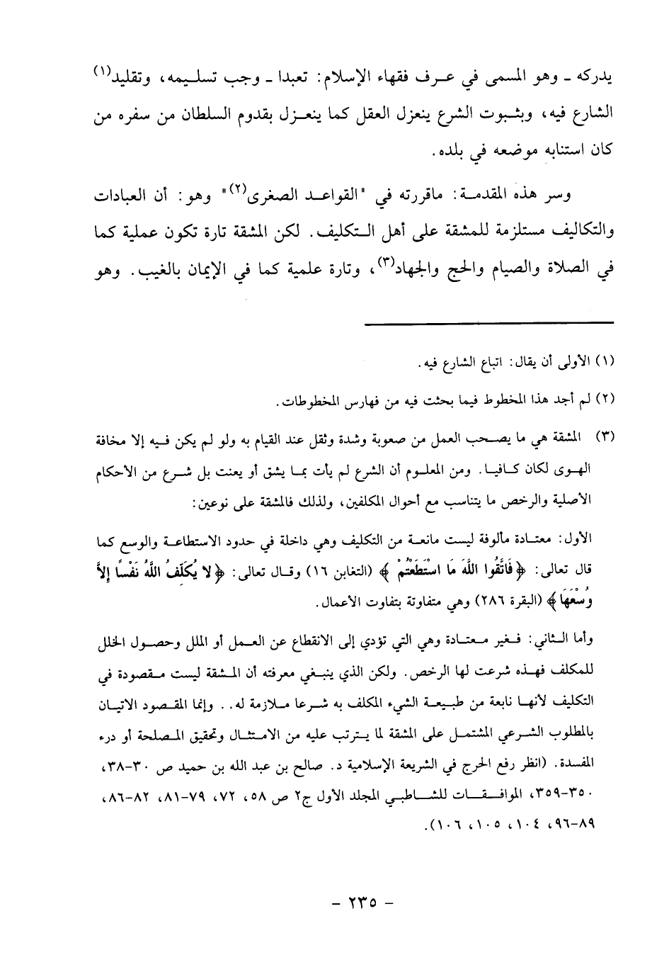 (3) المشقة هي ما يصحب العمل من صعوبة وشدة وثقل عند القيام به ولو لم يكن فيه إلا مخافة الهوى لكان كافيا. ومن المعلوم أن الشرع لم يأت بما يشق أو يعنت بل شرع من الأحكام الأصلية والرخص ما يتناسب مع أحوال المكلفين، ولذلك فالمشقة على نوعين: