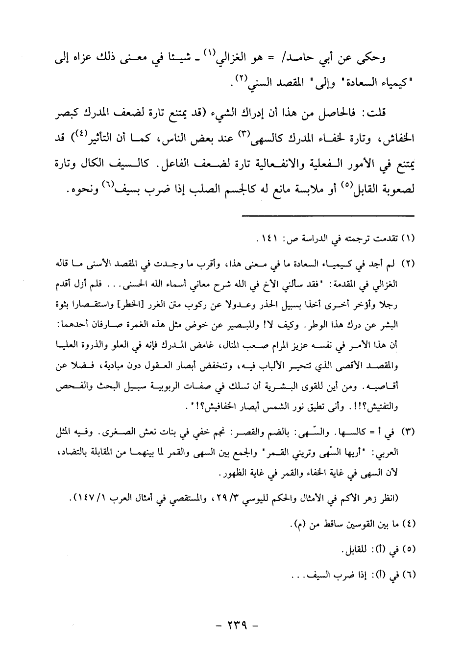 وحكى عن أبي حامد/ هو الغزالي «1» - شيئا في معنى ذلك عزاه إلى" كيمياء السعادة" وإلى" المقصد السني «2».