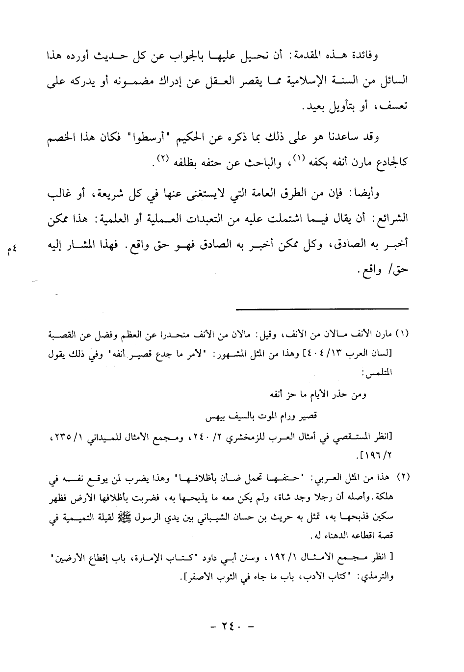 وقد ساعدنا هو على ذلك بما ذكره عن الحكيم" أرسطو" فكان هذا الخصم كالجادع مارن أنفه بكفه «1»، والباحث عن حتفه بظلفه «2».