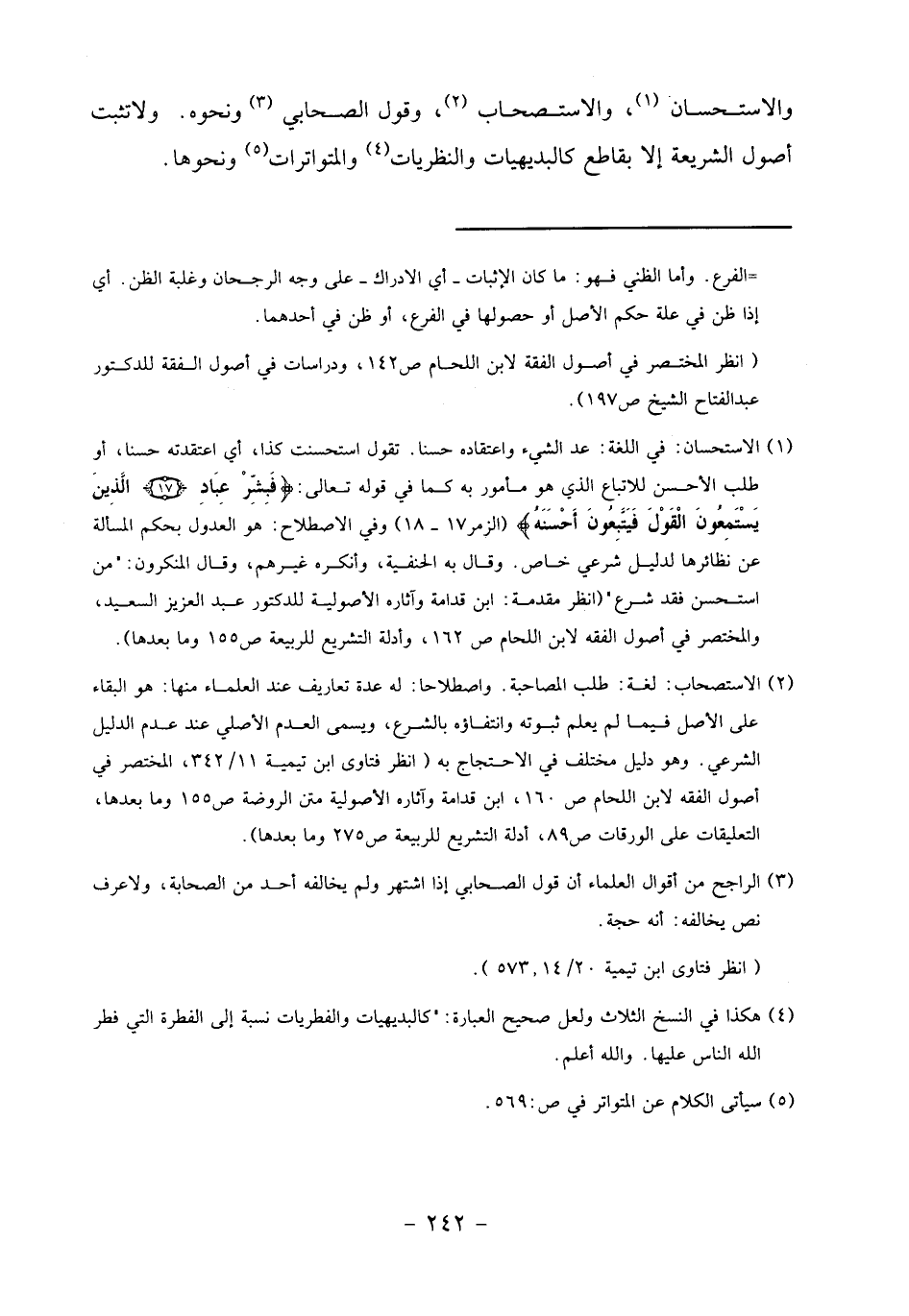 والاستحسان «1»، والاستصحاب «2»، وقول الصحابي «3» ونحوه. ولا تثبت أصول الشريعة إلا بقاطع كالبديهيات والنظريات «4» والمتواترات «5» ونحوها.