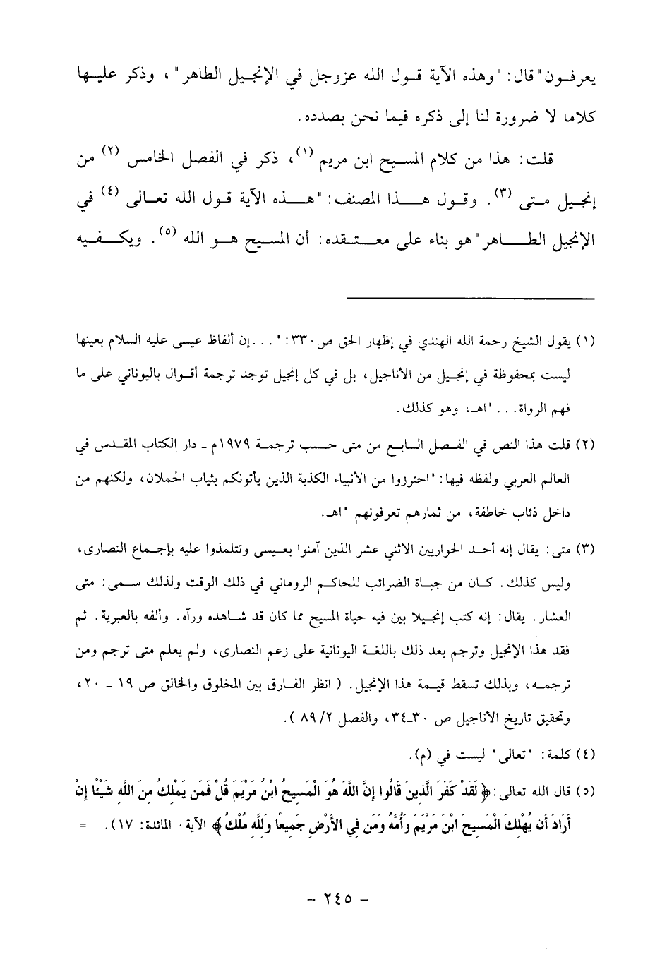 (1) يقول الشيخ رحمة الله الهندي في إظهار الحق ص 330:" ... إن ألفاظ عيسى عليه السلام بعينها ليست بمحفوظة في إنجيل من الأناجيل، بل في كل إنجيل توجد ترجمة أقوال باليوناني على ما فهم الرواة ... " اهـ، وهو كذلك.