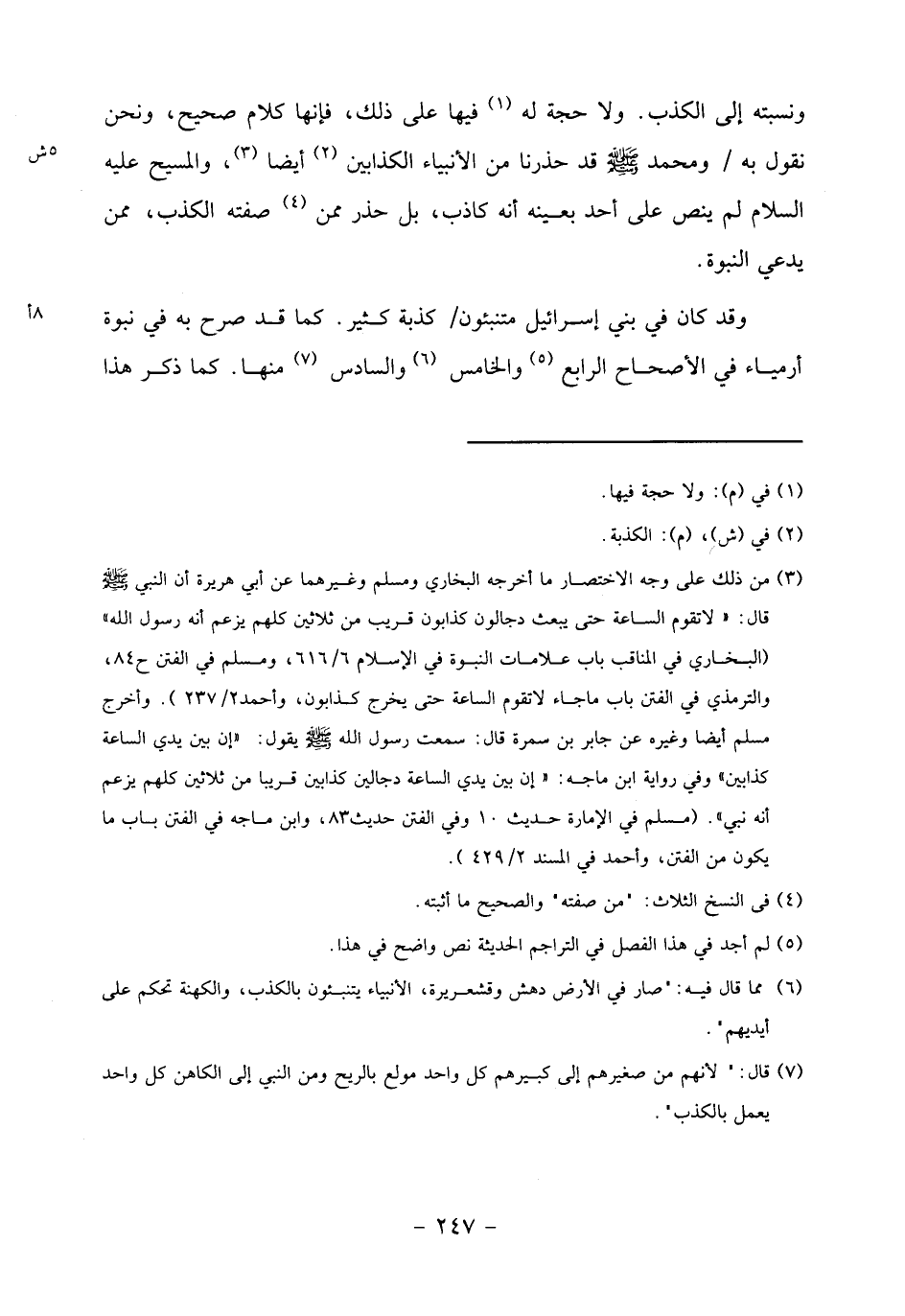 (3) من ذلك على وجه الاختصار ما أخرجه البخاري ومسلم وغيرهما عن أبي هريرة أن النبي صلّى الله عليه وسلم قال: «لا تقوم الساعة حتى يبعث دجالون كذابون قريب من ثلاثين كلهم يزعم أنه رسول الله» (البخاري في المناقب باب علامات النبوة في الإسلام 6/ 616، ومسلم في الفتن ح 84، والترمذي في الفتن باب ما جاء لا تقوم الساعة حتى يخرج كذابون، وأحمد 2/ 237). وأخرج مسلم أيضا وغيره عن جابر بن سمرة قال: سمعت رسول الله صلّى الله عليه وسلم يقول: «إن بين يدي الساعة كذابين» وفي رواية ابن ماجه: «إن بين يدي الساعة دجالين كذابين قريبا من ثلاثين كلهم يزعم أنه نبي». (مسلم في الإمارة حديث 10 وفي الفتن حديث 83، وابن ماجه في الفتن باب ما يكون من الفتن، وأحمد في المسند 2/ 429).