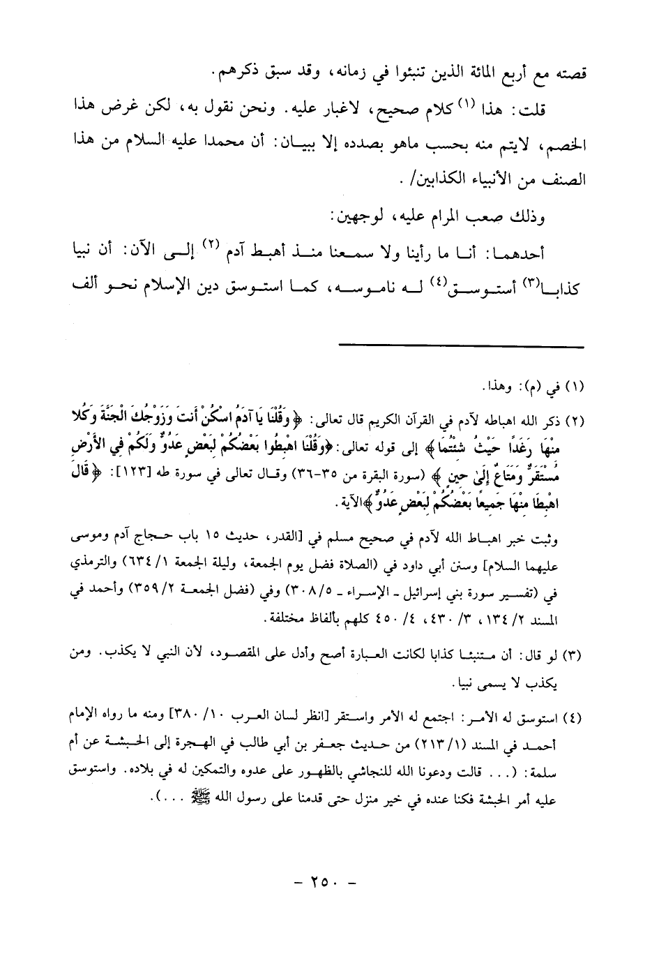 قلت: هذا «1» كلام صحيح، لا غبار عليه. ونحن نقول به، لكن غرض هذا الخصم، لا يتم منه بحسب ما هو بصدده إلا ببيان: أن محمدا عليه السلام من هذا الصنف من الأنبياء الكذابين/.