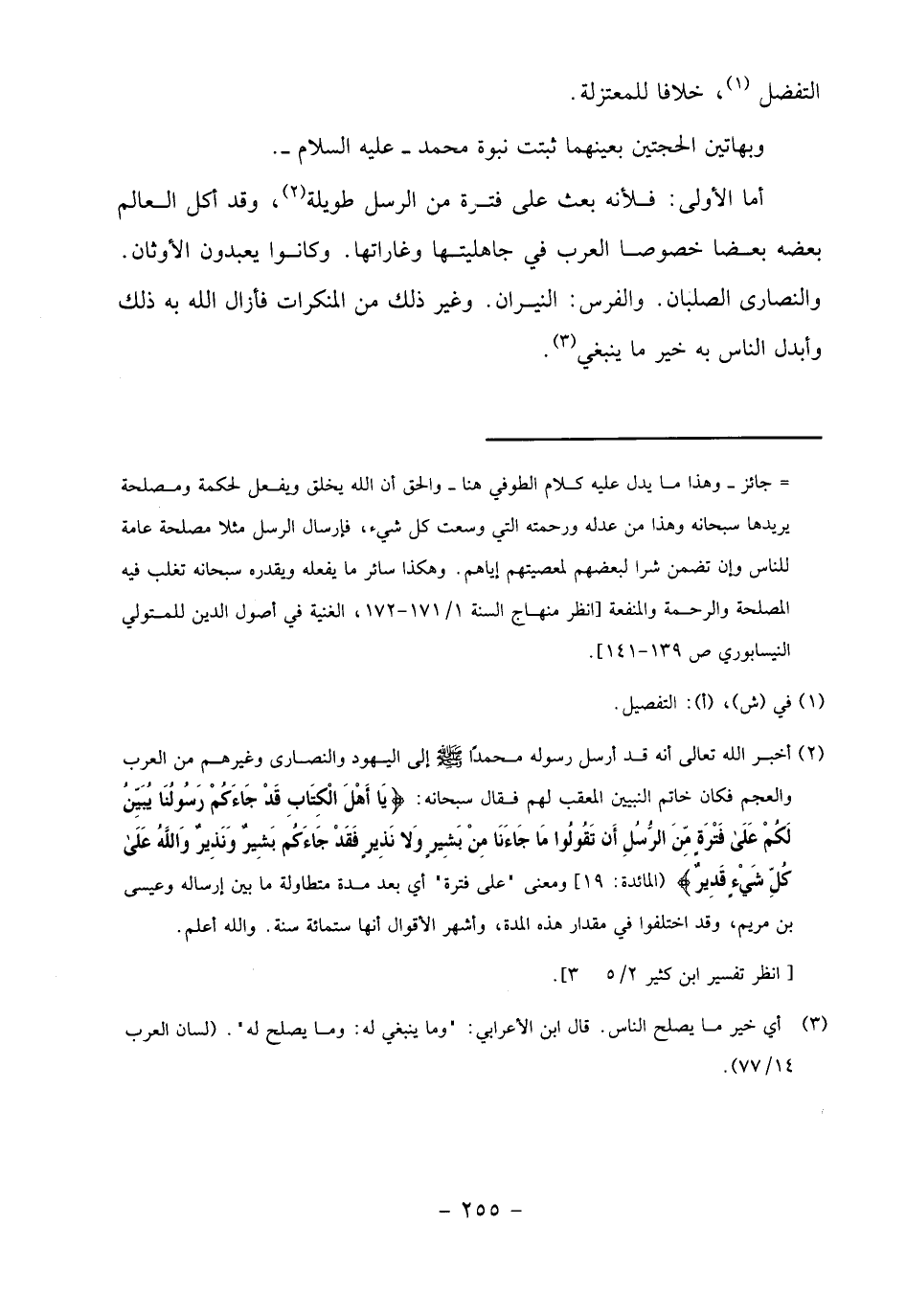 - جائز- وهذا ما يدل عليه كلام الطوفي هنا- والحق أن الله يخلق ويفعل لحكمة ومصلحة يريدها سبحانه وهذا من عدله ورحمته التي وسعت كل شيء، فإرسال الرسل مثلا مصلحة عامة للناس وإن تضمن شرا لبعضهم لمعصيتهم إياهم. وهكذا سائر ما يفعله ويقدره سبحانه تغلب فيه المصلحة والرحمة والمنفعة [انظر منهاج السنة 1/ 171 - 172، الغنية في أصول الدين للمتولي النيسابوري ص 139 - 141].