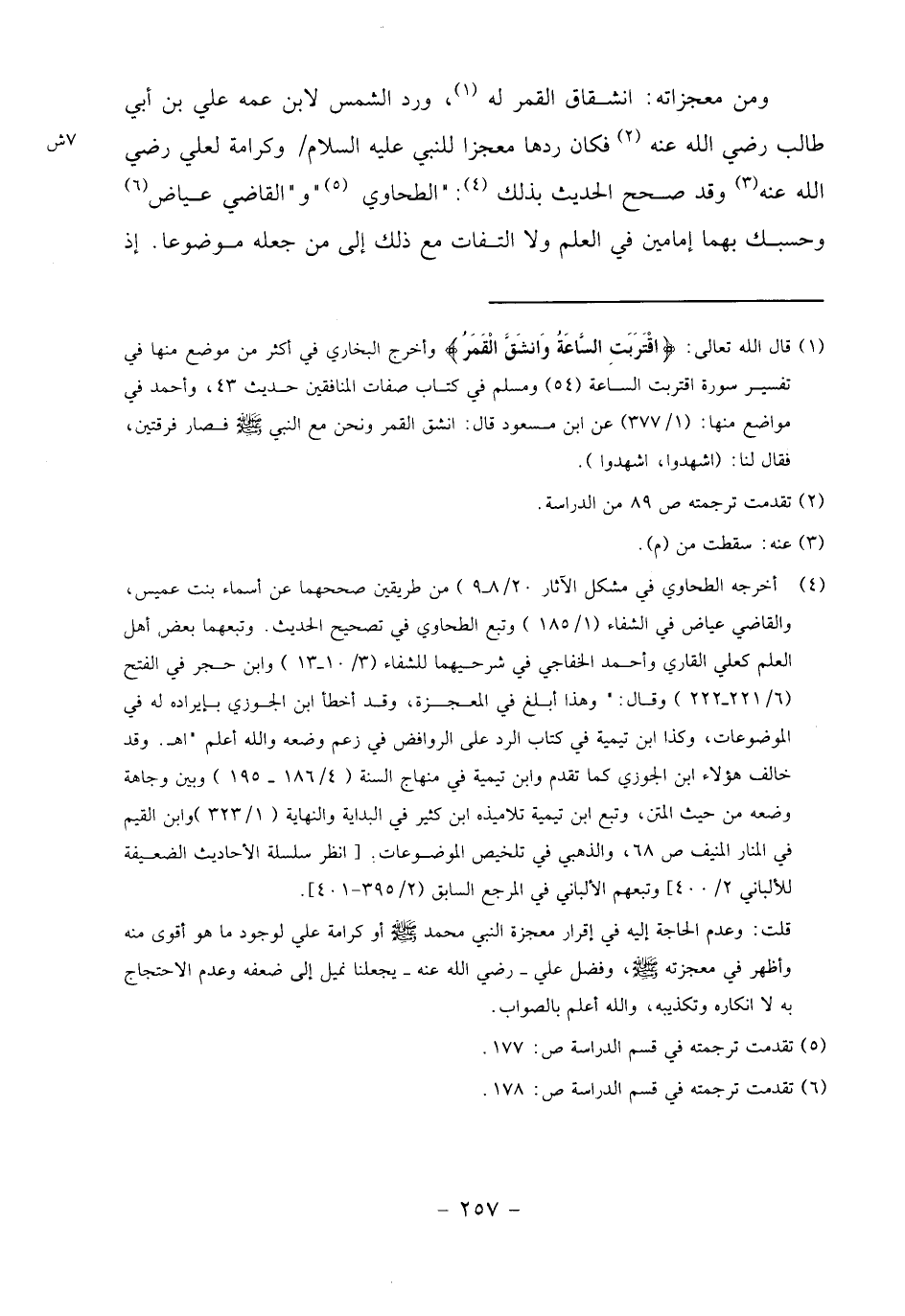 ومن معجزاته: انشقاق القمر له «1»، ورد الشمس لابن عمه علي بن أبي طالب رضي الله عنه «2» فكان ردها معجزا للنبي عليه السلام/ وكرامة لعلي رضي الله عنه «3» وقد صحح الحديث بذلك «4»:" الطحاوي «5» " و" القاضي عياض «6» وحسبك بهما إمامين في العلم ولا التفات مع ذلك إلى من جعله موضوعا. إذ