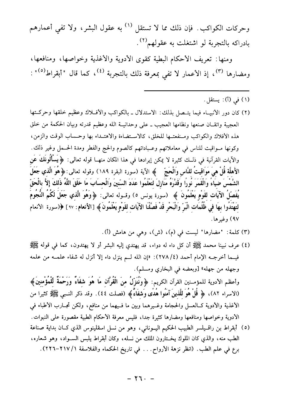 ومنها: تعريف الأحكام البطنية كقوى الأدوية والأغذية وخواصها، ومنافعها، ومضارها «3»، إذ الأعمار لا تفي بمعرفة ذلك بالتجربة «4»، كما قال" أبقراط «5» ":