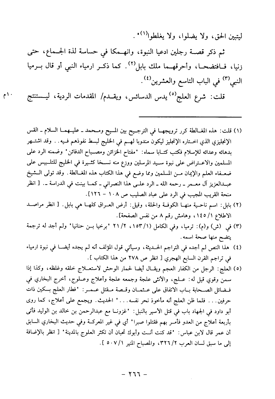 (1) قلت: هذه المغالطة كرر ترويجها في الترجيح بين المسيح ومحمد- عليهما السلام- القس الإنجليزي الذي اختاره الإنجليز ليكون مندوبا لهم في الخليج لبسط نفوذهم فيه ... وقد اشتهر بدهائه وعدائه للإسلام فكتب كتابا سماه:" مفتاح الخزائن ومصباح الدفائن" وضمنه الرد على المسلمين والاعتراض على نبوة سيد المرسلين ووزع منه نسخا كثيرة في الخليج للتلبيس على ضعفاء العلم والإيمان من المسلمين ومما وضع في هذا الكتاب هذه المغالطة. وقد تولى الشيخ عبد العزيز آل معمر- رحمه الله- الرد على هذا النصراني- كما بينت في الدراسة-. [انظر منحة القريب المجيب في الرد على عباد الصليب ص 108 - 126].