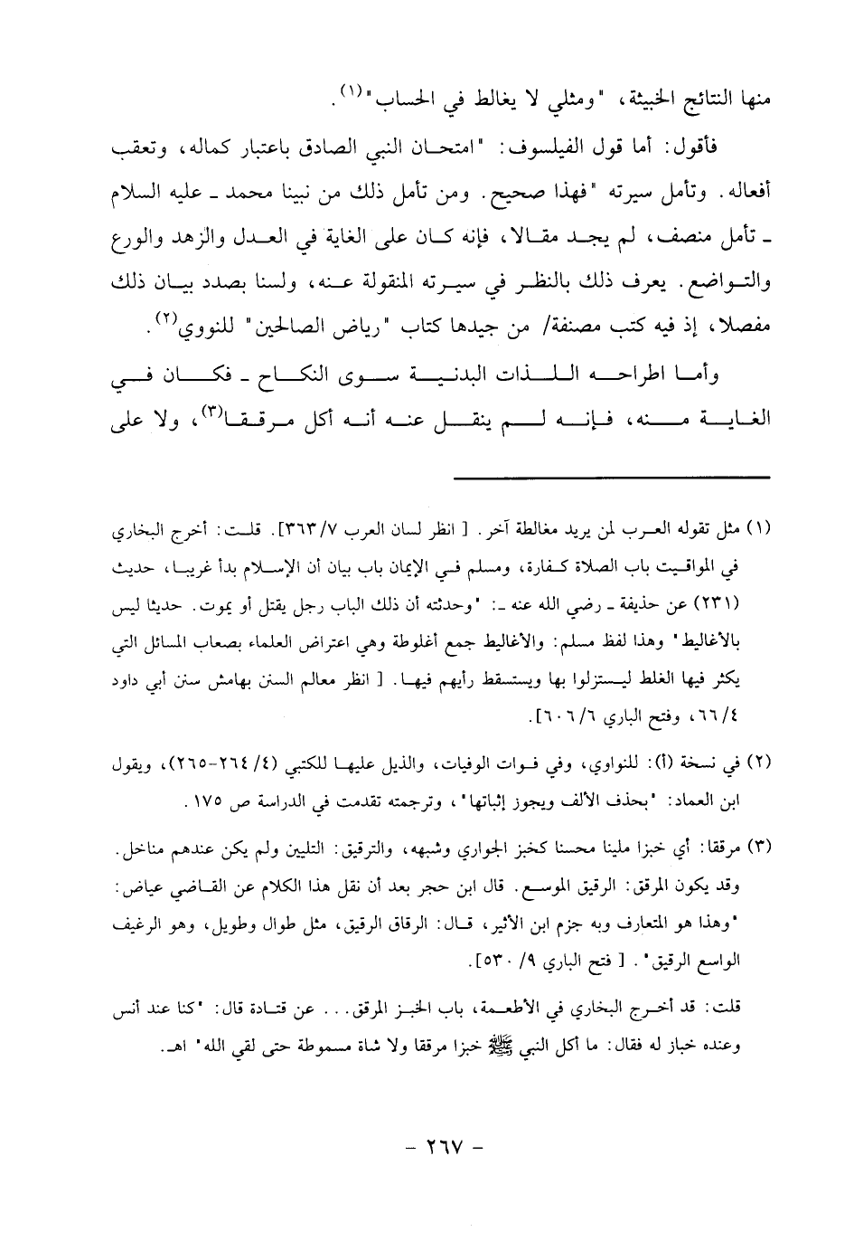 فأقول: أما قول الفيلسوف:" امتحان النبي الصادق باعتبار كماله، وتعقب أفعاله. وتأمل سيرته" فهذا صحيح. ومن تأمل ذلك من نبينا محمد- عليه السلام- تأمل منصف، لم يجد مقالا، فإنه كان على الغاية في العدل والزهد والورع والتواضع. يعرف ذلك بالنظر في سيرته المنقولة عنه، ولسنا بصدد بيان ذلك مفصلا، إذ فيه كتب مصنفة/ من جيدها كتاب" رياض الصالحين" للنووي «2».