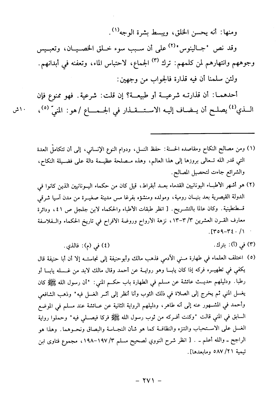 (5) اختلف العلماء في طهارة مني الآدمي فذهب مالك وأبو حنيفة إلى نجاسته إلا أن أبا حنيفة قال يكفي في تطهيره فركه إذا كان يابسا وهو رواية عن أحمد وقال مالك لا بد من غسله يابسا أو رطبا. ودليلهم حديث عائشة عن مسلم في الطهارة باب حكم المني:" أن رسول الله صلّى الله عليه وسلم كان يغسل المني ثم يخرج إلى الصلاة في ذلك الثوب وأنا أنظر إلى أثر الغسل فيه" وذهب الشافعي وأحمد في المشهور عنه إلى أنه طاهر، ودليلهم الرواية الثانية عن عائشة عند مسلم في الموضع السابق في المني قالت" وكنت أفركه من ثوب رسول الله صلّى الله عليه وسلم فركا فيصلي فيه" وحملوا رواية الغسل على الاستحباب والتنزه والنظافة كما هو شأن النجاسة والبصاق ونحوهما. وهذا هو الراجح- والله أعلم-. [انظر شرح النووي لصحيح مسلم 3/ 197 - 198، مجموع فتاوى ابن تيمية 21/ 587 وما بعدها].