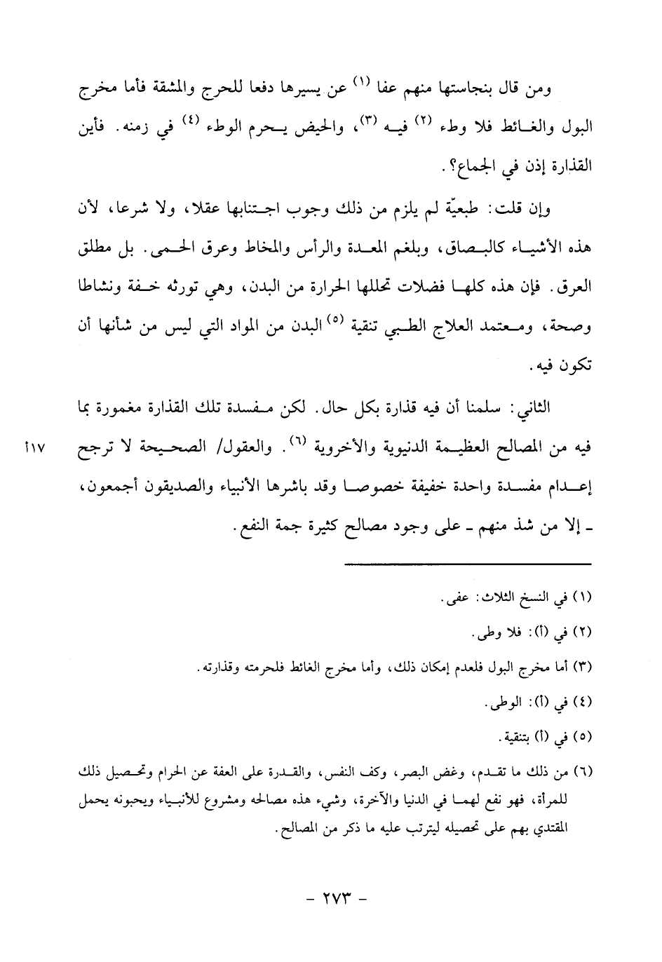 الثاني: سلمنا أن فيه قذارة بكل حال. لكن مفسدة تلك القذارة مغمورة بما فيه من المصالح العظيمة الدنيوية والأخروية «6». والعقول/ الصحيحة لا ترجح إعدام مفسدة واحدة خفيفة خصوصا وقد باشرها الأنبياء والصديقون أجمعون،- إلا من شذ منهم- على وجود مصالح كثيرة جمة النفع.