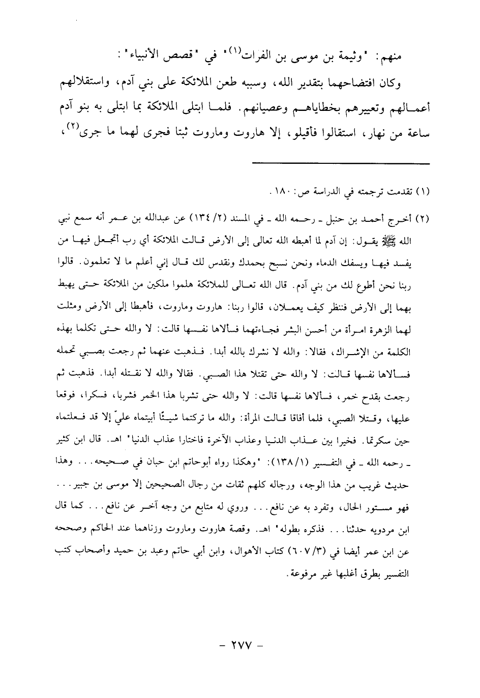 (2) أخرج أحمد بن حنبل- رحمه الله- في المسند (2/ 134) عن عبد الله بن عمر أنه سمع نبي الله صلّى الله عليه وسلم يقول: إن آدم لما أهبطه الله تعالى إلى الأرض قالت الملائكة أي رب أتجعل فيها من يفسد فيها ويسفك الدماء ونحن نسبح بحمدك ونقدس لك قال إني أعلم ما لا تعلمون. قالوا ربنا نحن أطوع لك من بني آدم. قال الله تعالى للملائكة هلموا ملكين من الملائكة حتى يهبط بهما إلى الأرض فننظر كيف يعملان، قالوا ربنا: هاروت وماروت، فأهبطا إلى الأرض ومثلث لهما الزهرة امرأة من أحسن البشر فجاءتهما فسألاها نفسها قالت: لا والله حتى تكلما بهذه الكلمة من الإشراك، فقالا: والله لا نشرك بالله أبدا. فذهبت عنهما ثم رجعت بصبي تحمله فسألاها نفسها قالت: لا والله حتى تقتلا هذا الصبي. فقالا والله لا نقتله أبدا. فذهبت ثم رجعت بقدح خمر، فسألاها نفسها قالت: لا والله حتى تشربا هذا الخمر فشربا، فسكرا، فوقعا عليها، وقتلا الصبي، فلما أفاقا قالت المرأة: والله ما تركتما شيئا أبيتماه عليّ إلا قد فعلتماه حين سكرتما. فخيرا بين عذاب الدنيا وعذاب الآخرة فاختارا عذاب الدنيا" اهـ. قال ابن كثير- رحمه الله- في التفسير (1/ 138):" وهكذا رواه أبو حاتم ابن حبان في صحيحه ... وهذا حديث غريب من هذا الوجه، ورجاله كلهم ثقات من رجال الصحيحين إلا موسى بن جبير ...