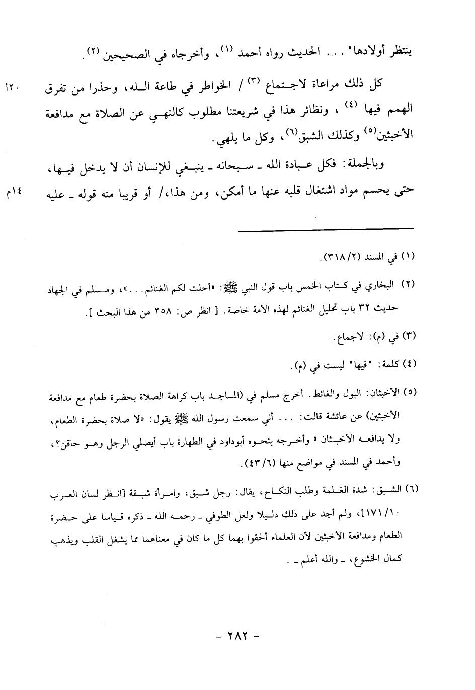 (6) الشبق: شدة الغلمة وطلب النكاح، يقال: رجل شبق، وامرأة شبقة [انظر لسان العرب 10/ 171]، ولم أجد على ذلك دليلا ولعل الطوفي- رحمه الله- ذكره قياسا على حضرة الطعام ومدافعة الأخبثين لأن العلماء ألحقوا بهما كل ما كان في معناهما مما يشغل القلب ويذهب كمال الخشوع،- والله أعلم-.