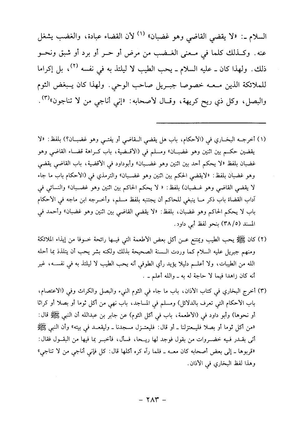 السلام-: «لا يقضي القاضي وهو غضبان» «1» لأن القضاء عبادة، والغضب يشغل عنه. وكذلك كلما في معنى الغضب من مرض أو حر أو برد أو شبق ونحو ذلك. ولهذا كان- عليه السلام- يحب الطيب لا ليلتذ به في نفسه «2»، بل إكراما للملائكة الذين معه خصوصا جبريل صاحب الوحي. ولهذا كان يبغض الثوم والبصل، وكل ذي ريح كريهة، وقال لأصحابه: «إني أناجي من لا تناجون» «3».