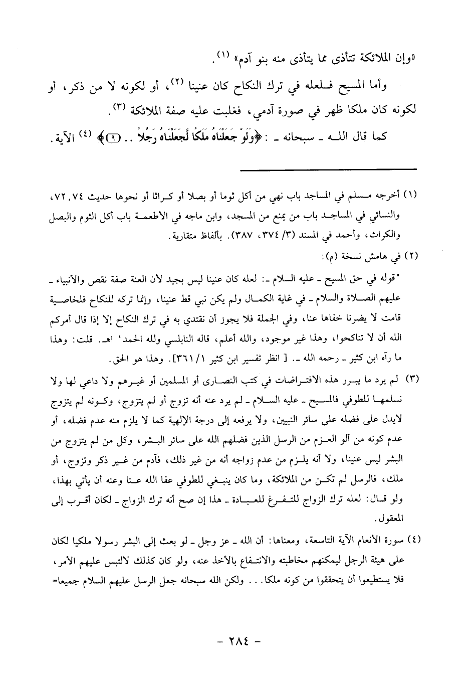 (3) لم يرد ما يبرر هذه الافتراضات في كتب النصارى أو المسلمين أو غيرهم ولا داعي لها ولا نسلمها للطوفي فالمسيح- عليه السلام- لم يرد عنه أنه تزوج أو لم يتزوج، وكونه لم يتزوج لا يدل على فضله على سائر النبيين، ولا يرفعه إلى درجة الإلهية كما لا يلزم منه عدم فضله، أو عدم كونه من أولو العزم من الرسل الذين فضلهم الله على سائر البشر، وكل من لم يتزوج من البشر ليس عنينا، ولا أنه يلزم من عدم زواجه أنه من غير ذلك، فآدم من غير ذكر وتزوج، أو ملك، فالرسل لم تكن من الملائكة، وما كان ينبغي للطوفي عفا الله عنا وعنه أن يأتي بهذا، ولو قال: لعله ترك الزواج للتفرغ للعبادة- هذا إن صح أنه ترك الزواج- لكان أقرب إلى المعقول.