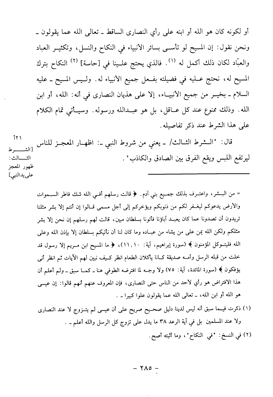 أو لكونه كان هو الله أو ابنه على رأي النصارى الساقط- تعالى الله عما يقولون- ونحن نقول: إن المسيح لو تأسى بسائر الأنبياء في النكاح والنسل، وتكثير العباد والعبّاد لكان ذلك أكمل له «1». فالذي يحتج علينا في [حاسة] «2» النكاح بترك المسيح له، نحتج عليه في فضيلته بفعل جميع الأنبياء له. وليس المسيح- عليه السلام- بخير من جميع الأنبياء، إلا على هذيان النصارى في أنه: الله، أو ابن الله. وذلك ممنوع عند كل عاقل، بل هو عبد الله ورسوله. وسيأتي تمام الكلام على هذا الشرط عند ذكر تفاصيله.