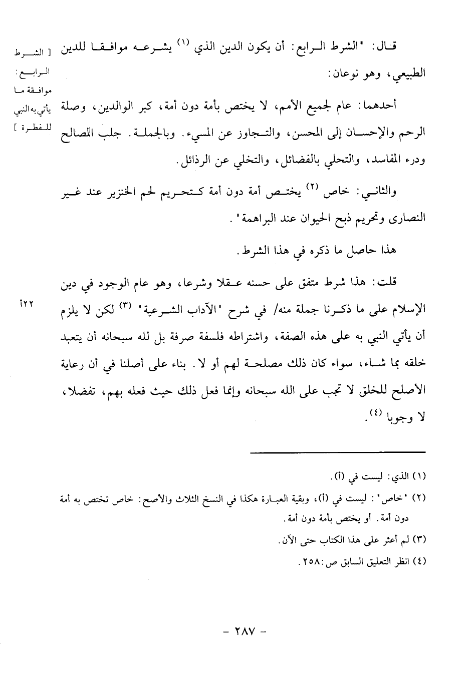 قال:" الشرط الرابع: أن يكون الدين الذي «1» يشرعه موافقا للدين الطبيعي، وهو نوعان: