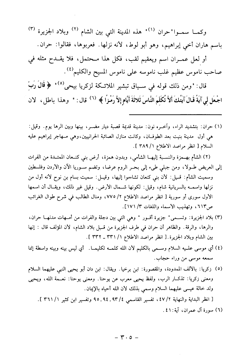 (5) زكريا: بالألف الممدودة، والمقصورة: ابن برخيا. ويقال: ابن دان أبو يحيى النبي عليهما السلام ومعنى زكريا: تذكار الرب، ولفظ يحيى معرب عن يوحنا. ومعنى يوحنا: نعمة الله، ويحيى ولد خالة عيسى عليهما السلام وسمي بذلك لأن الله أحياه بالإيمان.