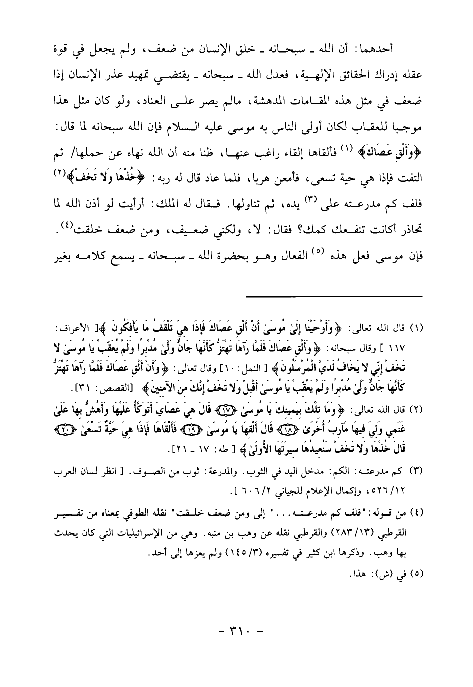 117] وقال سبحانه: وأَلْقِ عَصاكَ فَلَمَّا رَآها تَهْتَزُّ كَأَنَّها جَانٌّ وَلَّى مُدْبِراً ولَمْ يُعَقِّبْ يا مُوسى لا تَخَفْ إِنِّي لا يَخافُ لَدَيَّ الْمُرْسَلُونَ [النمل: 10] وقال تعالى: وأَنْ أَلْقِ عَصاكَ فَلَمَّا رَآها تَهْتَزُّ كَأَنَّها جَانٌّ وَلَّى مُدْبِراً ولَمْ يُعَقِّبْ يا مُوسى أَقْبِلْ ولا تَخَفْ إِنَّكَ مِنَ الْآمِنِينَ [القصص: 31].