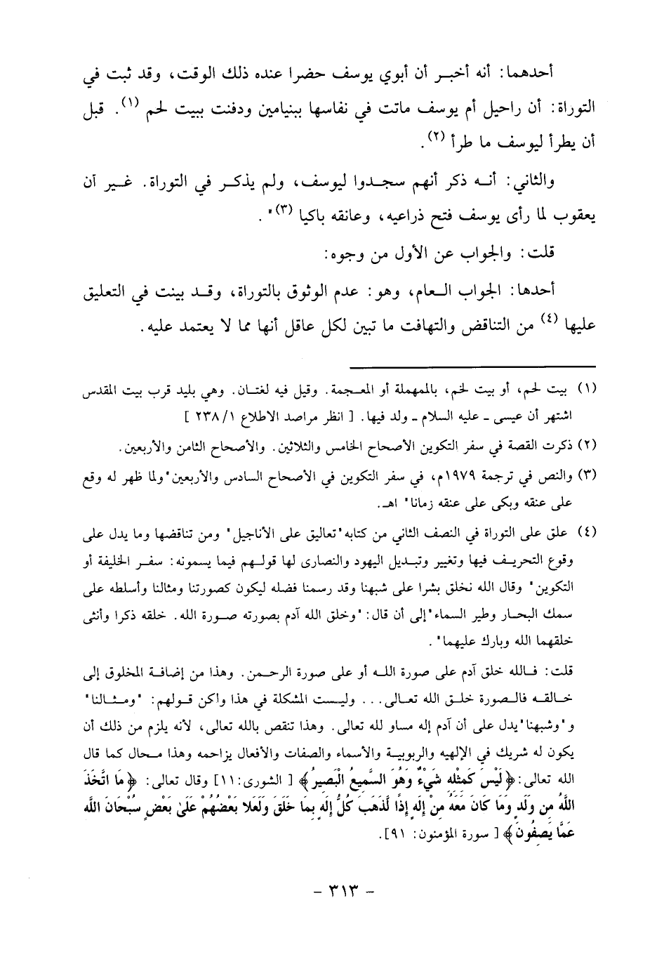 أحدها: الجواب العام، وهو: عدم الوثوق بالتوراة، وقد بينت في التعليق عليها «4» من التناقض والتهافت ما تبين لكل عاقل أنها مما لا يعتمد عليه.