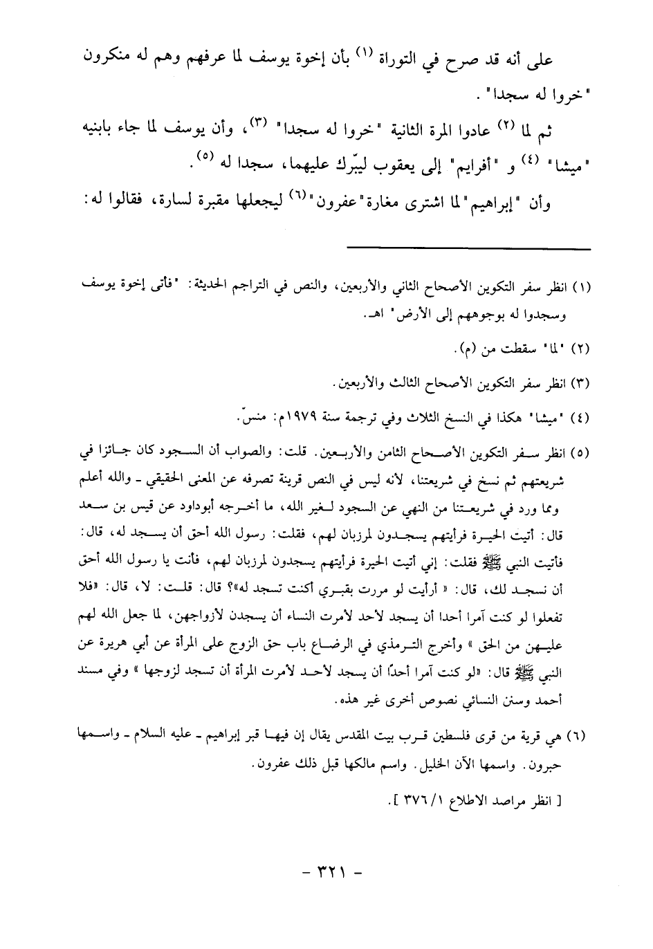 (5) انظر سفر التكوين الأصحاح الثامن والأربعين. قلت: والصواب أن السجود كان جائزا في شريعتهم ثم نسخ في شريعتنا، لأنه ليس في النص قرينة تصرفه عن المعنى الحقيقي- والله أعلم ومما ورد في شريعتنا من النهي عن السجود لغير الله، ما أخرجه أبو داود عن قيس بن سعد قال: أتيت الحيرة فرأيتهم يسجدون لمرزبان لهم، فقلت: رسول الله أحق أن يسجد له، قال: