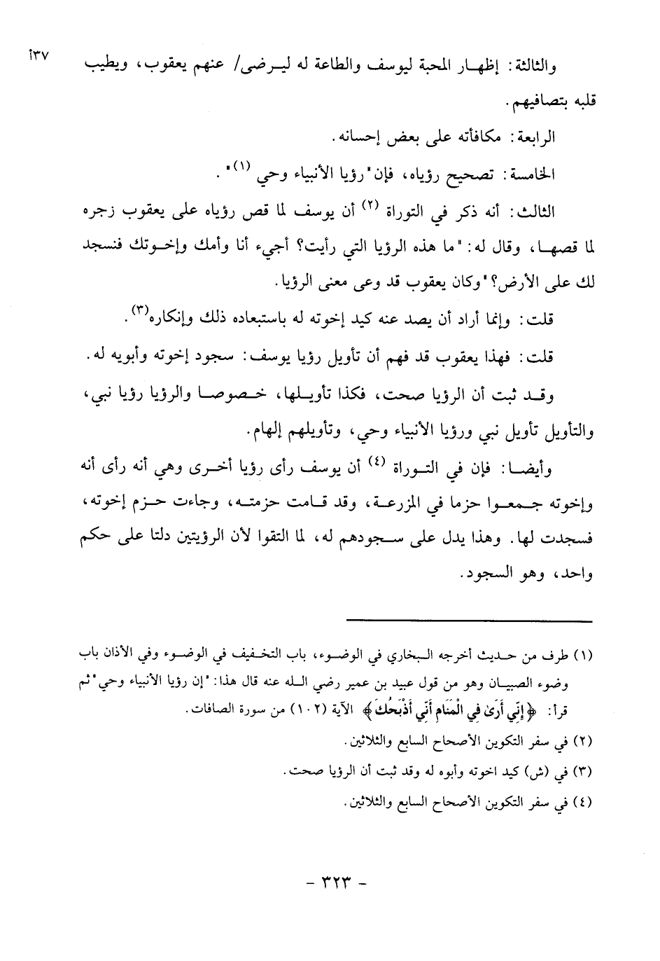 وأيضا: فإن في التوراة «4» أن يوسف رأى رؤيا أخرى وهي أنه رأى أنه وإخوته جمعوا حزما في المزرعة، وقد قامت حزمته، وجاءت حزم إخوته، فسجدت لها. وهذا يدل على سجودهم له، لما التقوا لأن الرؤيتين دلتا على حكم واحد، وهو السجود.