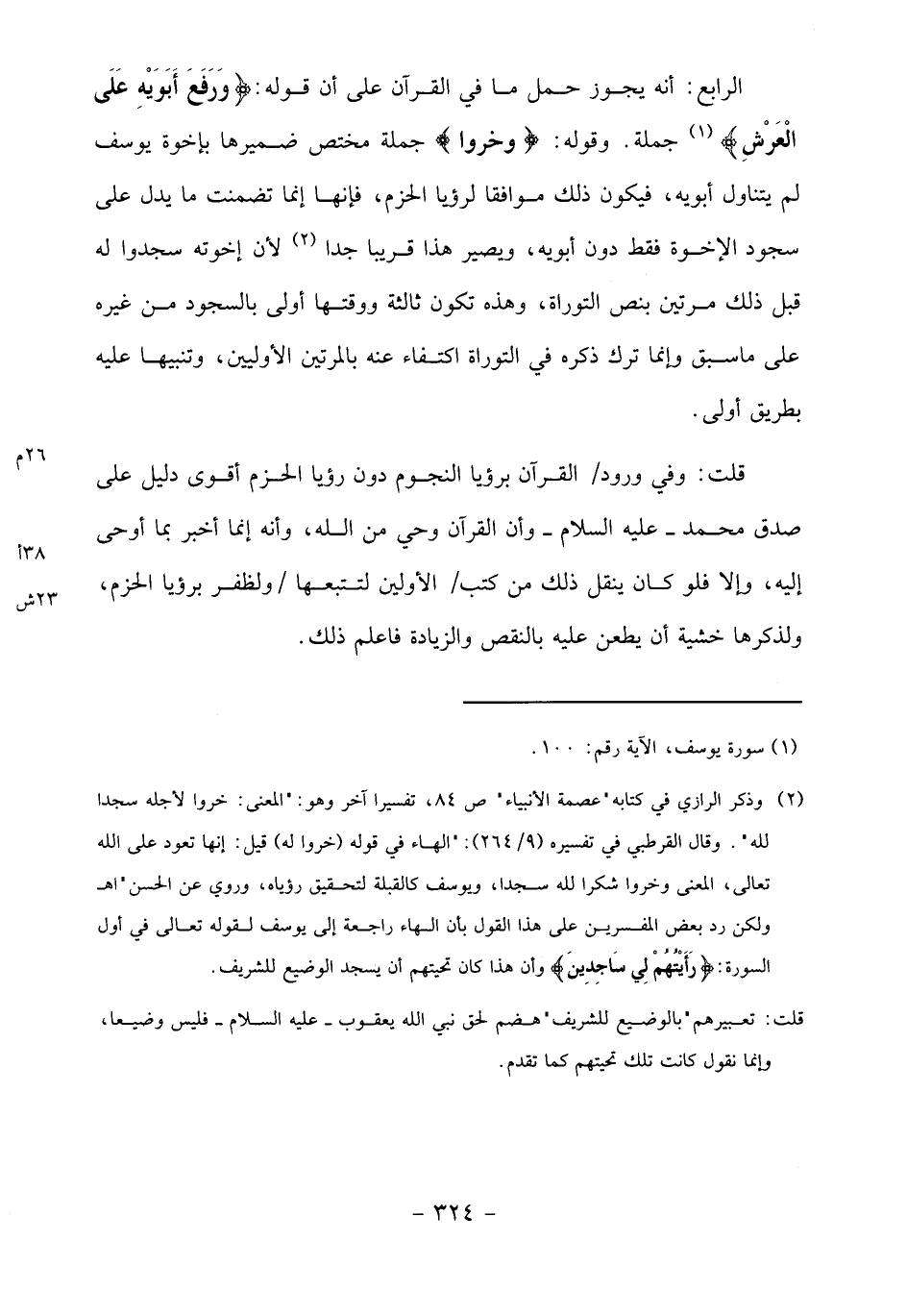 الرابع: أنه يجوز حمل ما في القرآن على أن قوله: ورَفَعَ أَبَوَيْهِ عَلَى الْعَرْشِ «1» جملة. وقوله: وخَرُّوا جملة مختص ضميرها بإخوة يوسف لم يتناول أبويه، فيكون ذلك موافقا لرؤيا الحزم، فإنها إنما تضمنت ما يدل على سجود الإخوة فقط دون أبويه، ويصير هذا قريبا جدا «2» لأن إخوته سجدوا له قبل ذلك مرتين بنص التوراة، وهذه تكون ثالثة ووقتها أولى بالسجود من غيره على ما سبق وإنما ترك ذكره في التوراة اكتفاء عنه بالمرتين الأوليين، وتنبيها عليه بطريق أولى.