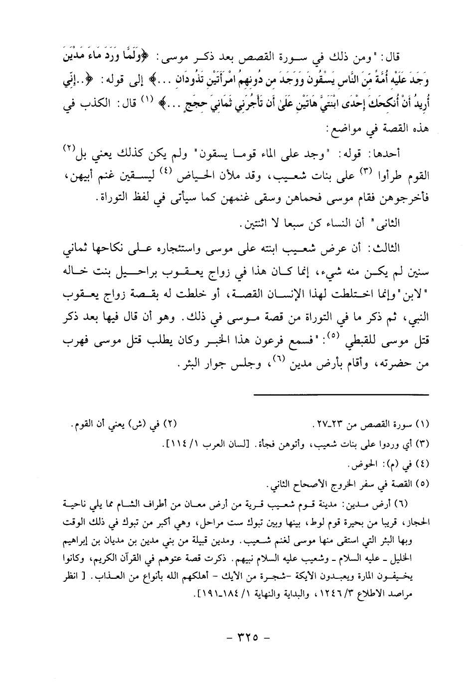 أحدها: قوله:" وجد على الماء قوما يسقون" ولم يكن كذلك يعني بل «2» القوم طرءوا «3» على بنات شعيب، وقد ملأن الحياض «4» ليسقين غنم أبيهن، فأخرجوهن فقام موسى فحماهن وسقى غنمهن كما سيأتي في لفظ التوراة.