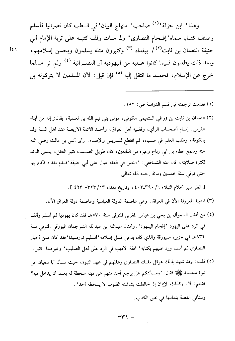 وهذا" ابن جزلة" «1» صاحب" منهاج البيان" في الطب كان نصرانيا فأسلم وصنف كتابا سماه" إفحام النصارى" ولما مات وقف كتبه على تربة الإمام أبي حنيفة النعمان بن ثابت «2» / ببغداد «3» وكثيرون مثله يسلمون ويحسن إسلامهم، وبعد ذلك يطعنون فيما كانوا عليه من اليهودية أو النصرانية «4» ولم نر مسلما خرج عن الإسلام، فحمد ما انتقل إليه «5» فإن قيل: لأن المسلمين لا يتركونه بل