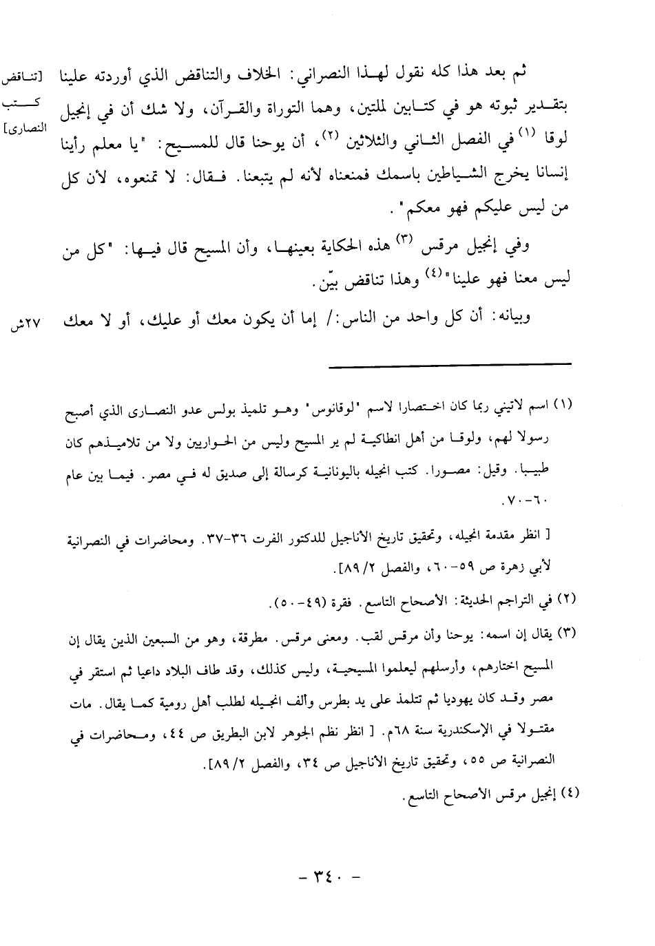 ثم بعد هذا كله نقول لهذا النصراني: الخلاف والتناقض الذي أوردته علينا بتقدير ثبوته هو في كتابين لملتين، وهما التوراة والقرآن، ولا شك أن في إنجيل لوقا «1» في الفصل الثاني والثلاثين «2»، أن يوحنا قال للمسيح:" يا معلم رأينا إنسانا يخرج الشياطين باسمك فمنعناه لأنه لم يتبعنا. فقال: لا تمنعوه، لأن كل من ليس عليكم فهو معكم".