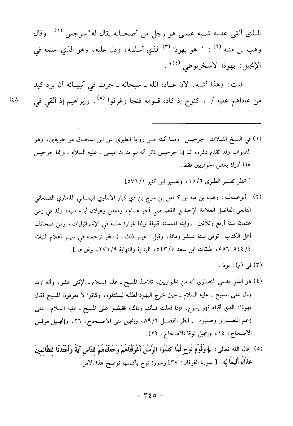 الذي ألقي عليه شبه عيسى هو رجل من أصحابه يقال له" سرجس «1» " وقال وهب بن منبه «2»:" هو يهوذا «3» الذي أسلمه، ودل عليه، وهو الذي اسمه في الإنجيل: يهوذا الاسخريوطي «4» ".