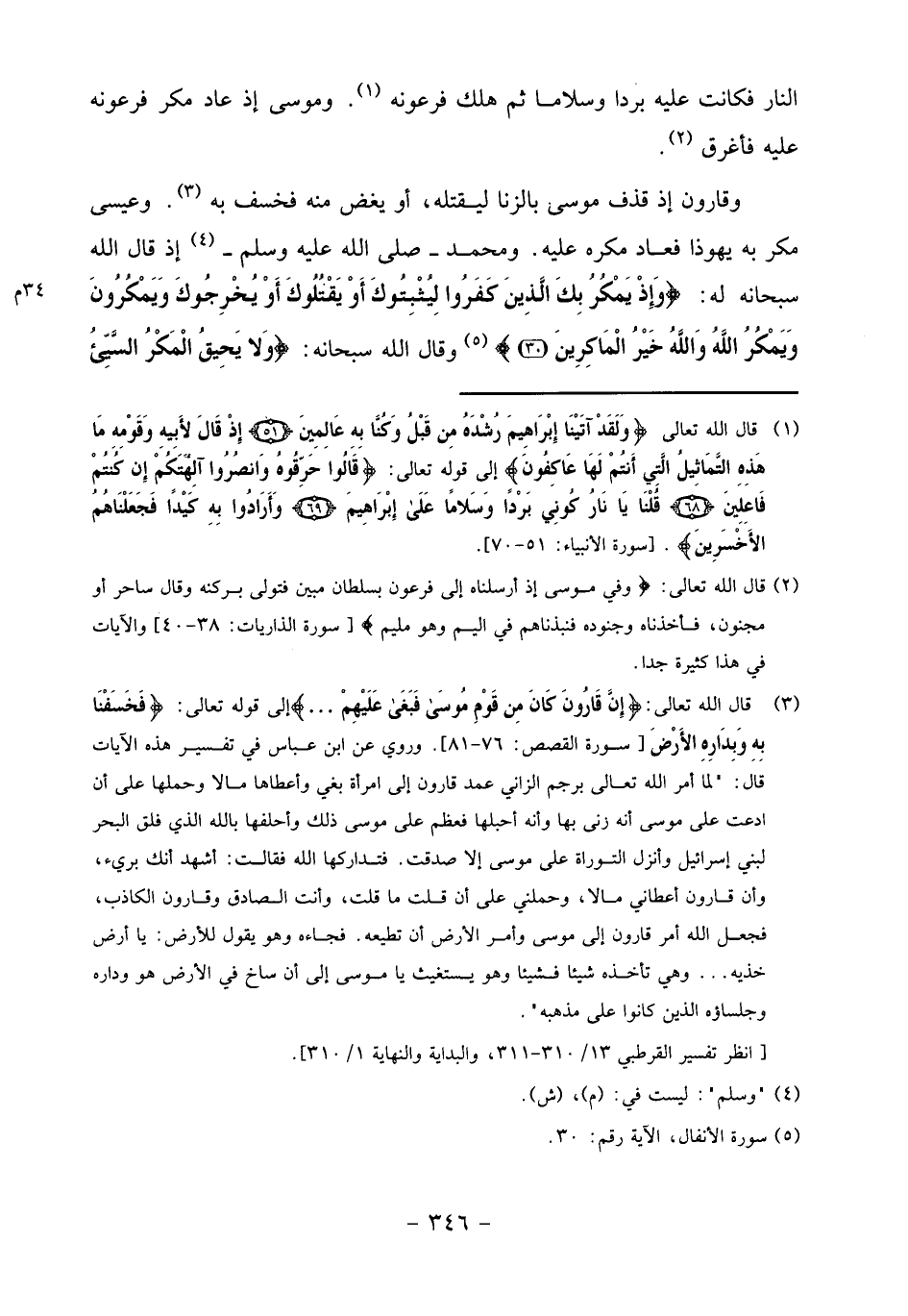 وقارون إذ قذف موسى بالزنا ليقتله، أو يغض منه فخسف به «3». وعيسى مكر به يهوذا فعاد مكره عليه. ومحمد- صلى الله عليه وسلم- «4» إذ قال الله سبحانه له: وإِذْ يَمْكُرُ بِكَ الَّذِينَ كَفَرُوا لِيُثْبِتُوكَ أَوْ يَقْتُلُوكَ أَوْ يُخْرِجُوكَ ويَمْكُرُونَ ويَمْكُرُ اللَّهُ واللَّهُ خَيْرُ الْماكِرِينَ (30) «5» وقال الله سبحانه: ولا يَحِيقُ الْمَكْرُ السَّيِّئُ