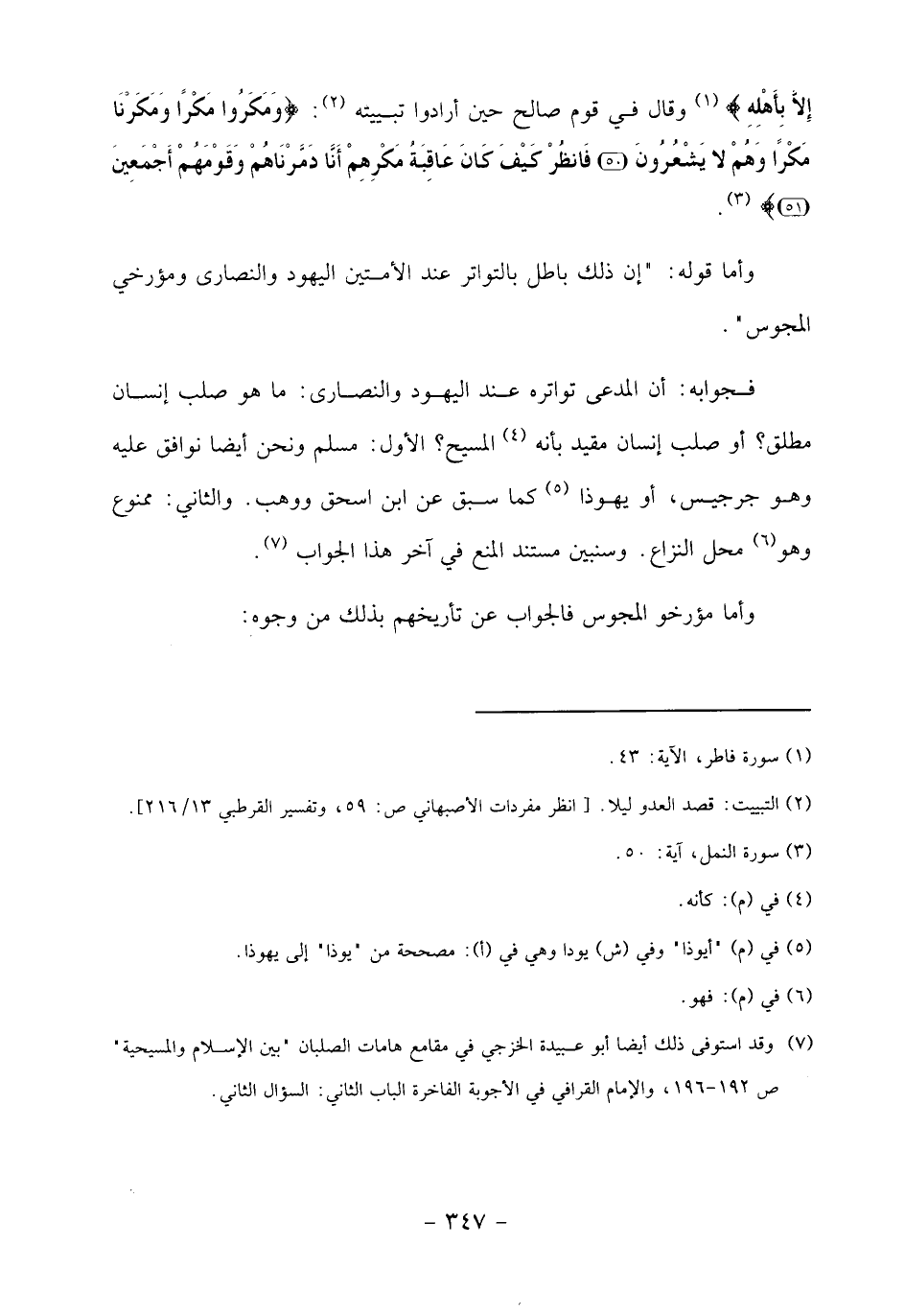 (7) وقد استوفى ذلك أيضا أبو عبيدة الخزرجي في مقامع هامات الصلبان" بين الإسلام والمسيحية" ص 192 - 196، والإمام القرافي في الأجوبة الفاخرة الباب الثاني: السؤال الثاني.