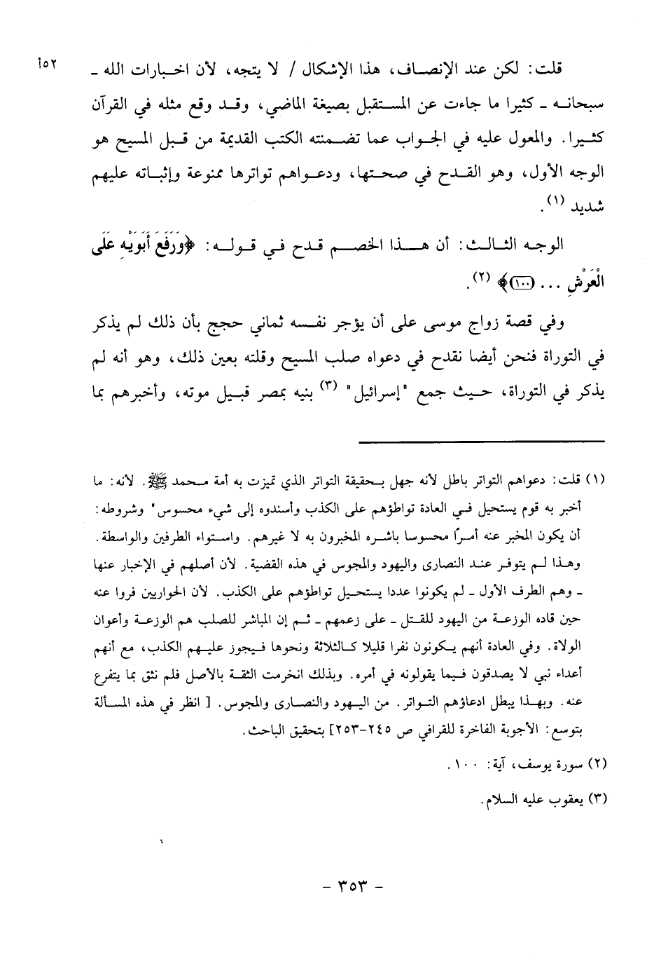 قلت: لكن عند الإنصاف، هذا الإشكال/ لا يتجه، لأن اخبارات الله- سبحانه- كثيرا ما جاءت عن المستقبل بصيغة الماضي، وقد وقع مثله في القرآن كثيرا. والمعول عليه في الجواب عما تضمنته الكتب القديمة من قبل المسيح هو الوجه الأول، وهو القدح في صحتها، ودعواهم تواترها ممنوعة وإثباته عليهم شديد «1».