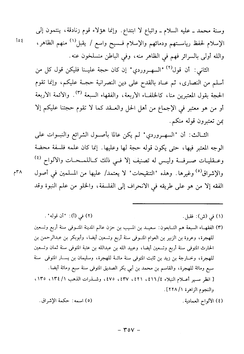 الثالث: أن" السهروردي" لم يكن عالما بأصول الشرائع والنبوات على الوجه المعتبر فيها، حتى يكون قوله حجة لها وعليها. إنما كان علمه فلسفة محضة وعقليات صرفة وليس له تصنيف إلا في ذلك كاللمحات والألواح «4» والإشراق «5» وغيرها. وهذه" التنقيحات" لا يعتمد/ عليها من المسلمين في أصول الفقه إلا من هو على طريقه في الانحراف إلى الفلسفة، والخلو من علم النبوة وقد