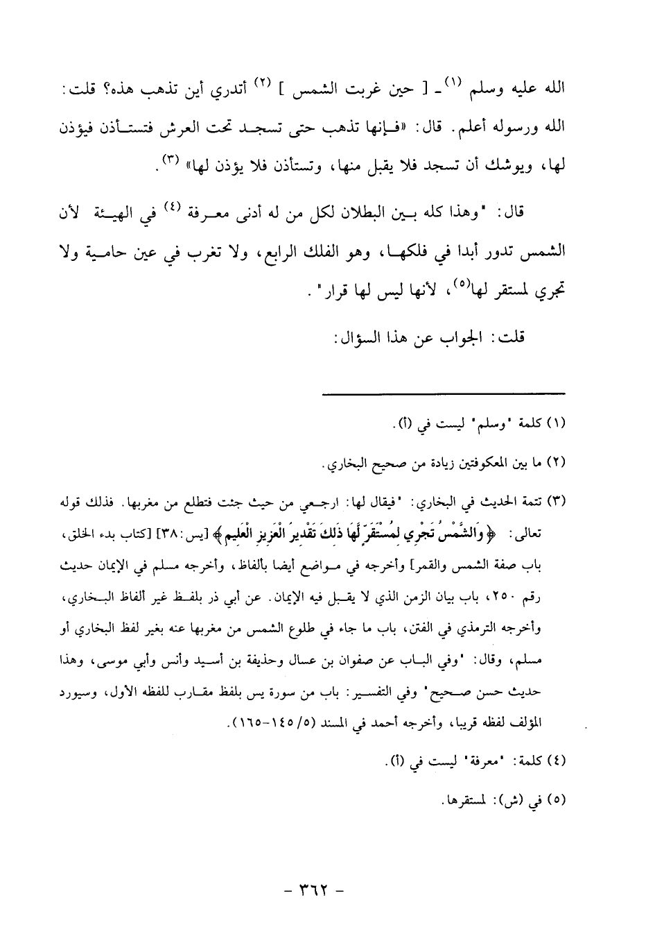 قال:" وهذا كله بين البطلان لكل من له أدنى معرفة «4» في الهيئة لأن الشمس تدور أبدا في فلكها، وهو الفلك الرابع، ولا تغرب في عين حامية ولا تجري لمستقر لها «5»، لأنها ليس لها قرار".