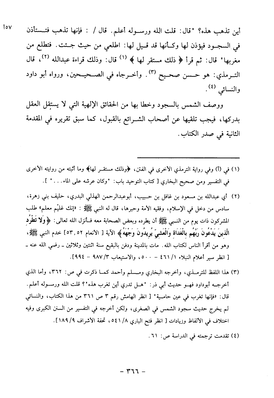 (3) هذا اللفظ للترمذي، وأخرجه البخاري ومسلم وأحمد كما ذكرت في ص: 362، وأما الذي أخرجه أبو داود فهو حديث أبي ذر:" هل تدري أين تغرب هذه"؟ قلت الله ورسوله أعلم.