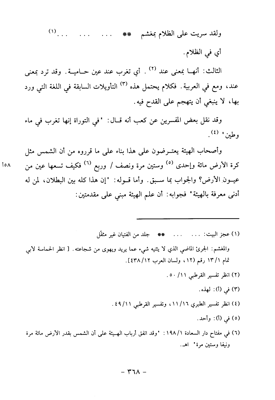 (6) في مفتاح دار السعادة 1/ 198:" وقد اتفق أرباب الهيئة على أن الشمس بقدر الأرض مائة مرة ونيفا وستين مرة" اهـ.