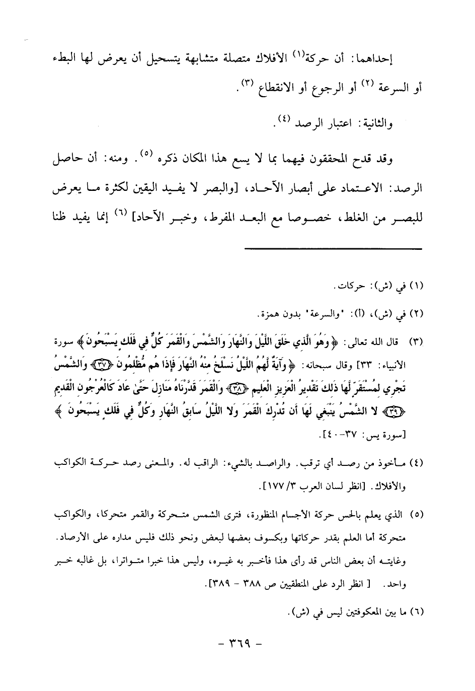 (5) الذي يعلم بالحس حركة الأجسام المنظورة، فترى الشمس متحركة والقمر متحركا، والكواكب متحركة أما العلم بقدر حركاتها وبكسوف بعضها لبعض ونحو ذلك فليس مداره على الأرصاد.