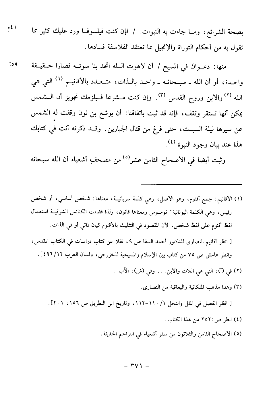 منها: دعواك في المسيح/ أن لاهوت الله اتحد بنا سوته فصارا حقيقة واحدة، أو أن الله- سبحانه- واحد بالذات، متعدد بالأقانيم «1» التي هي الله «2» والابن وروح القدس «3». وإن كنت مشرعا فيلزمك تجويز أن الشمس يمكن أنها تستقر وتقف، فإنه قد ثبت باتفاقنا: أن يوشع بن نون وقفت له الشمس عن سيرها ليلة السبت، حتى فرغ من قتال الجبارين. وقد ذكرته أنت في كتابك هذا عند بيان وجود النبوة «4».