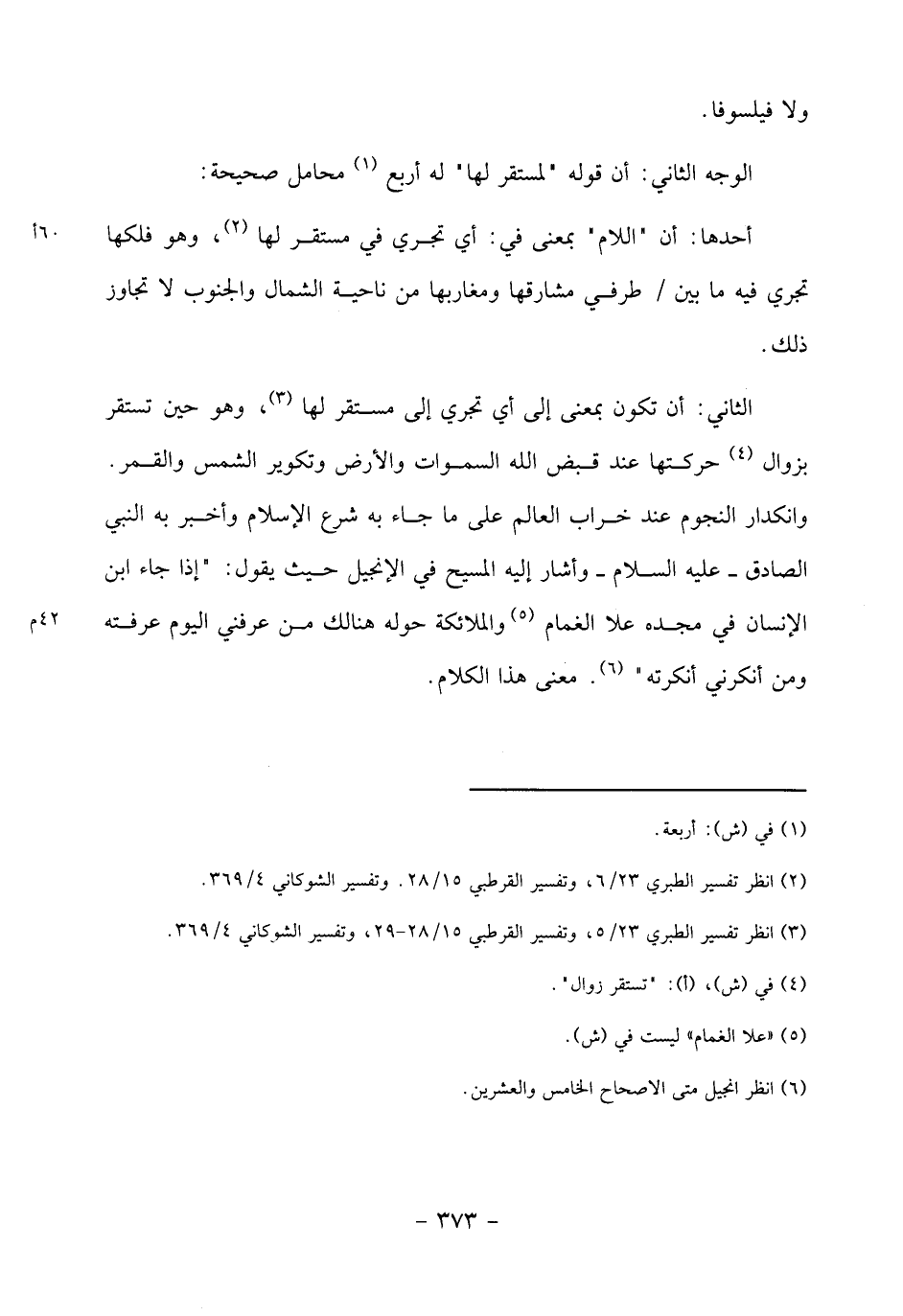 الوجه الثاني: أن قوله" لمستقر لها" له أربع «1» محامل صحيحة: