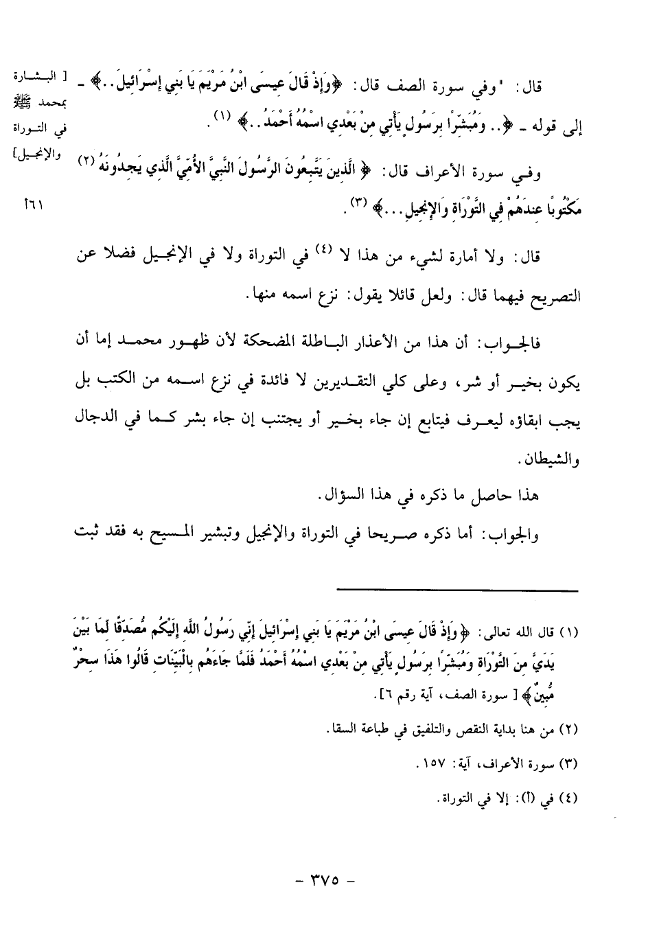 قال: ولا أمارة لشيء من هذا لا «4» في التوراة ولا في الإنجيل فضلا عن التصريح فيهما قال: ولعل قائلا يقول: نزع اسمه منها.