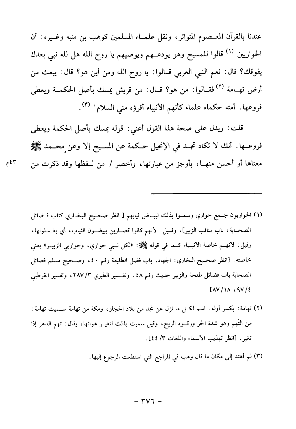 قلت: ويدل على صحة هذا القول أعني: قوله يمسك بأصل الحكمة ويعطى فروعها. أنك لا تكاد تجد في الإنجيل حكمة عن المسيح إلا وعن محمد صلّى الله عليه وسلّم معناها أو أحسن منها، بأوجز من عبارتها، وأخصر/ من لفظها وقد ذكرت من