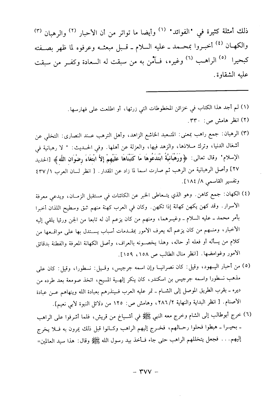 ذلك أمثلة كثيرة في" الفوائد" «1» وأيضا ما تواتر من أن الأحبار «2» والرهبان «3» والكهان «4» أخبروا بمحمد- عليه السلام- قبل مبعثه وعرفوه لما ظهر بصفته كبحيرا «5» الراهب «6» وغيره، فآمن به من سبقت له السعادة وكفر من سبقت عليه الشقاوة.