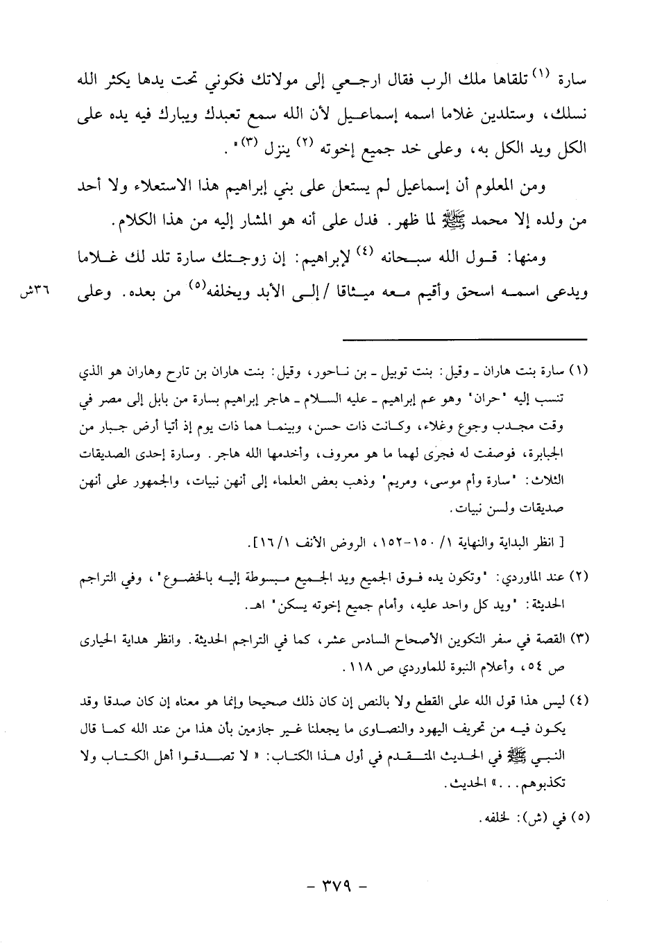 سارة «1» تلقاها ملك الرب فقال ارجعي إلى مولاتك فكوني تحت يدها يكثر الله نسلك، وستلدين غلاما اسمه إسماعيل لأن الله سمع تعبدك ويبارك فيه يده على الكل ويد الكل به، وعلى خد جميع إخوته «2» ينزل «3» ".